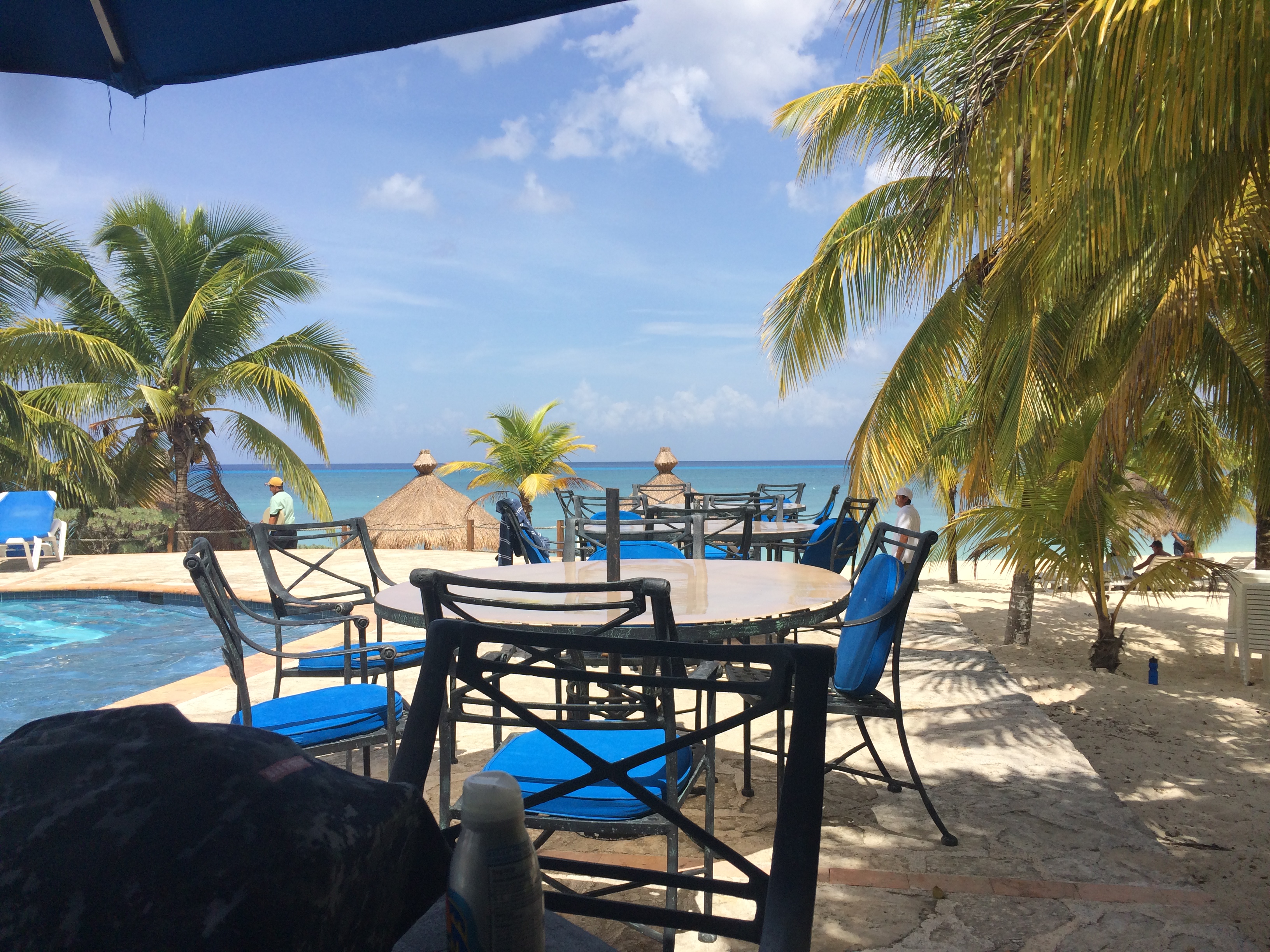 See? Paradise…except Holy Hot!!! We decided to move up to the pool area, and grab a table under an umbrella…added bonus? Closer to the bar! We had heard about a “signature” drink that they serve in Cozumel, the Dirty Monkey. Basically it is a banana daiquiri with a shot of Kahlua. It is YUMMY! Especially on a day that felt like a thousand degrees, they go down like slurpees! I’m pretty sure we had at least 3 each…before lunch!