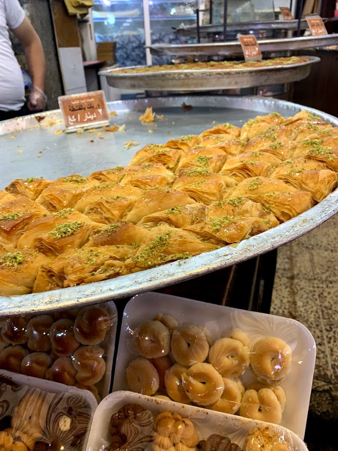 We left Hashem to make our way to another street vendor for dessert. Kunafeh. A cheese, semolina, honey, pistachio concoction that is crazy good and crazy sweet! The process for cutting the servings was an experience in itself! I am not sure I would still have all my fingers!