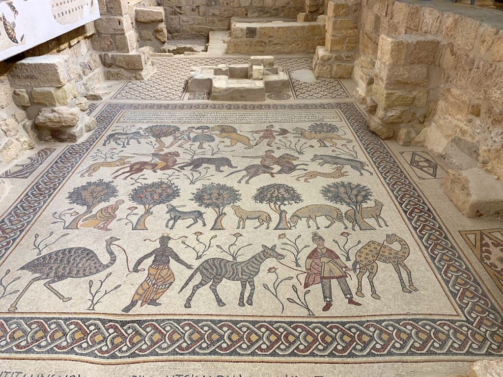 Then in the 3rd or 4th century, a small church was built there and it became an important pilgrimage site. In fact, the monks began showing pilgrims an empty “tomb of Moses.” The church was expanded into a grand basilica with an amazing collection of Byzantine mosaics and an elaborate baptistry. Little is left of this early building, but in the 1930’s the site was excavated and many of the mosaics were uncovered. They are still mostly intact and they are breathtaking!